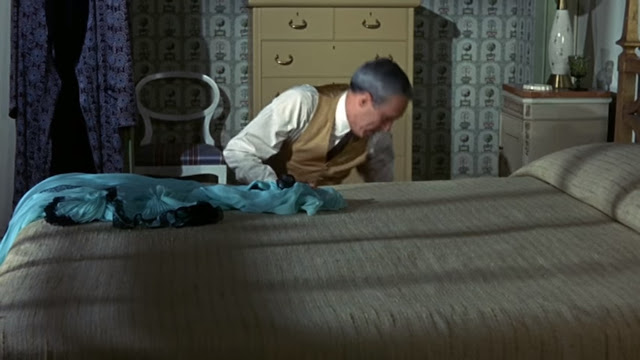 To throw off his unwanted advances, Ellen tricks Mr. Cleeves into hiding in the storage room, which she tells him is the bedroom.